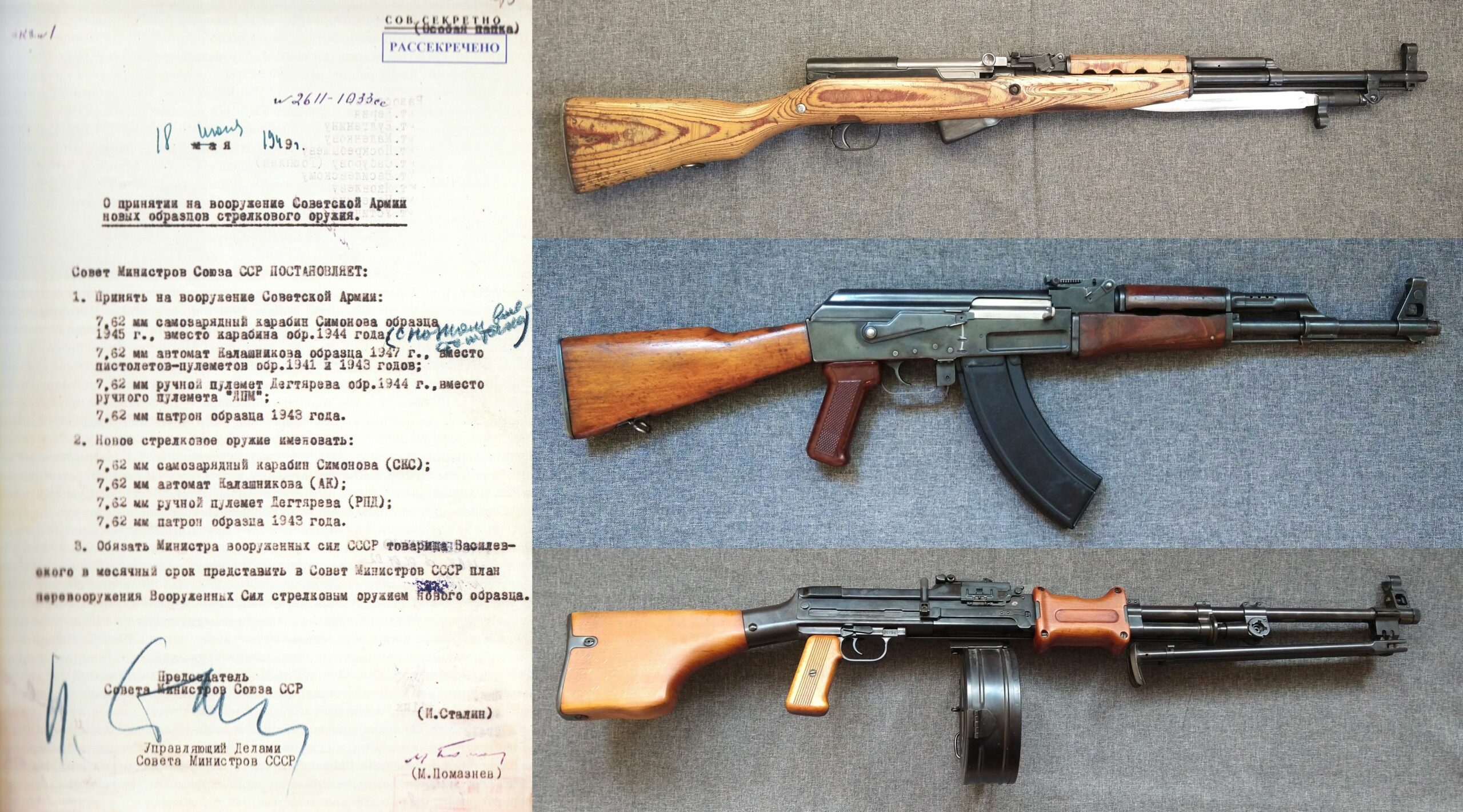Przeanalizowano dwa typy broni, strzelającej takimi nabojami – zdobyczne niemieckie MKb.42(H) i otrzymane z USA karabinki M1. Rezultatem tej oraz kolejnych narad, stała się decyzja o opracowaniu własnego naboju pośredniego kalibru 7,62 mm, przy czym zdecydowano o pójściu drogą niemiecką – skróceniu łuski naboju karabinowego (nabój amerykański wywodził się dla odmiany z naboju pistoletowego, którego łuskę przedłużono). Ów nowy radziecki nabój (konstrukcji N. M. Jelizarowa i B.W. Siemina) ostatecznie przybrał postać znaną jako 7,62 x 39 mm nabój wz. 43.